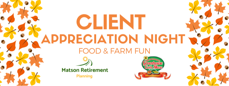 Join us in our tradition of kicking off fall with our 4th Annual Client Appreciation Night. Clients and their families are invited to join us McDonald's Greenhouse and Corn Maze for an evening of food and farm fun. Bring the kids, grandkids, and friends to enjoy a an old fashioned wiener roast. Carson Clouse Music is back to entertain us with country hits. Plus, enjoy the farm activities without the crowds!